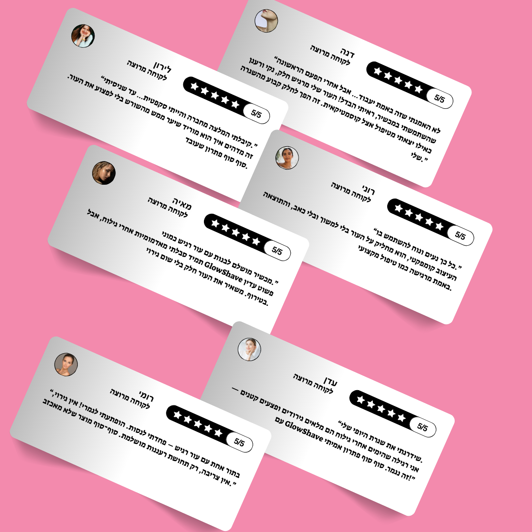 תמיד היה לי אדמומיות וגירודים אחרי גילוח. עם GlowShave זה נגמר. העור שלי חלק, רך ומוכן לכל מקום.”1.1k