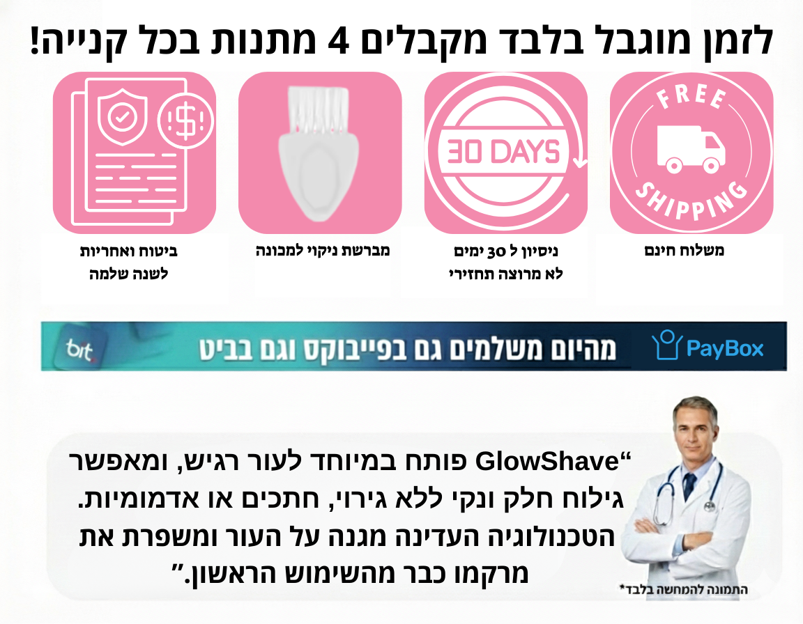 ייש לך 30 ימים לנסות את GlowShave™ בבית, בנוחות ובשקט שלך – עם משלוח חינם מאיתנו.